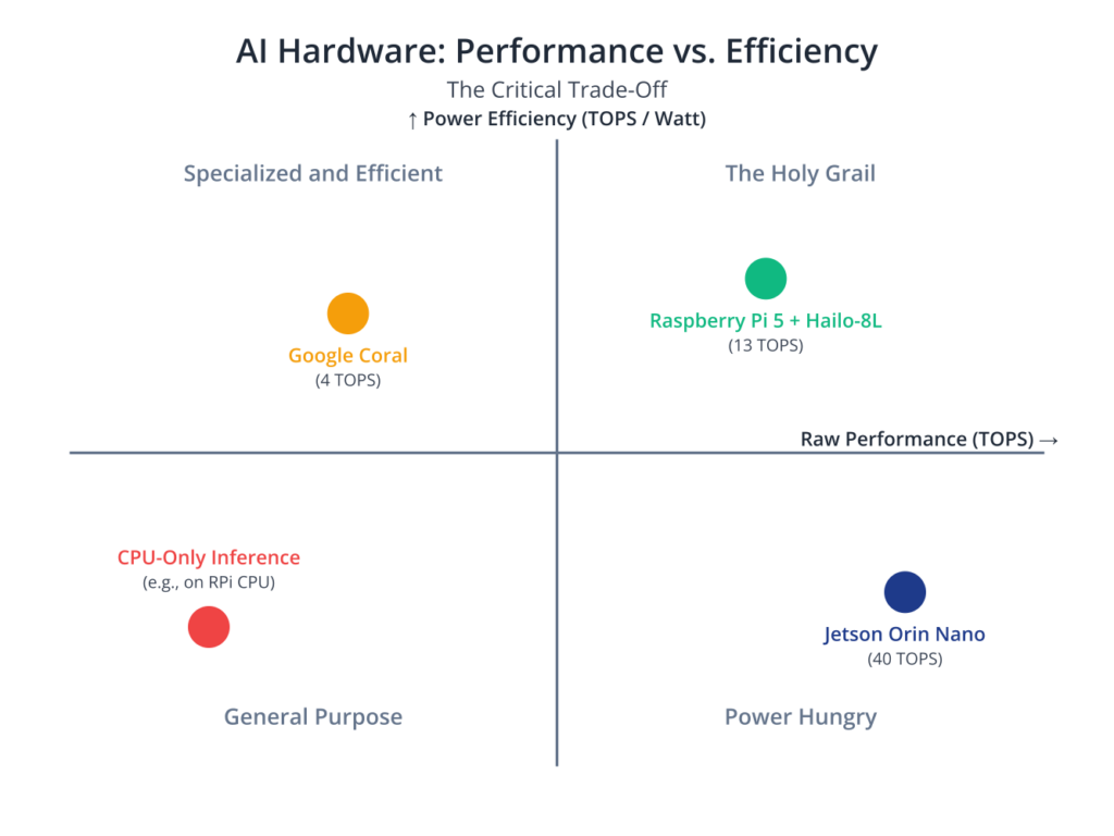 This reveals a fundamental difference in design philosophy. TOPS is a marketing metric; efficiency is an engineering constraint. For any device that will be untethered from a wall outlet or placed in a small, unventilated enclosure, power consumption and heat dissipation are the true physical limits. A 100 TOPS chip that requires a 50W power supply and a massive heatsink is a non-starter for a handheld scanner or a smart drone. This is where platforms like Hailo and Coral shine. The Hailo-8 architecture is a class leader in efficiency, achieving up to 10 TOPS/W, while the Coral Edge TPU offers a solid 2 TOPS/W.11 They are designed from the ground up for low-power applications. The NVIDIA Jetson, in contrast, is designed for maximum throughput, often in applications like industrial robotics or roadside computing units where a stable, high-wattage power source is readily available.