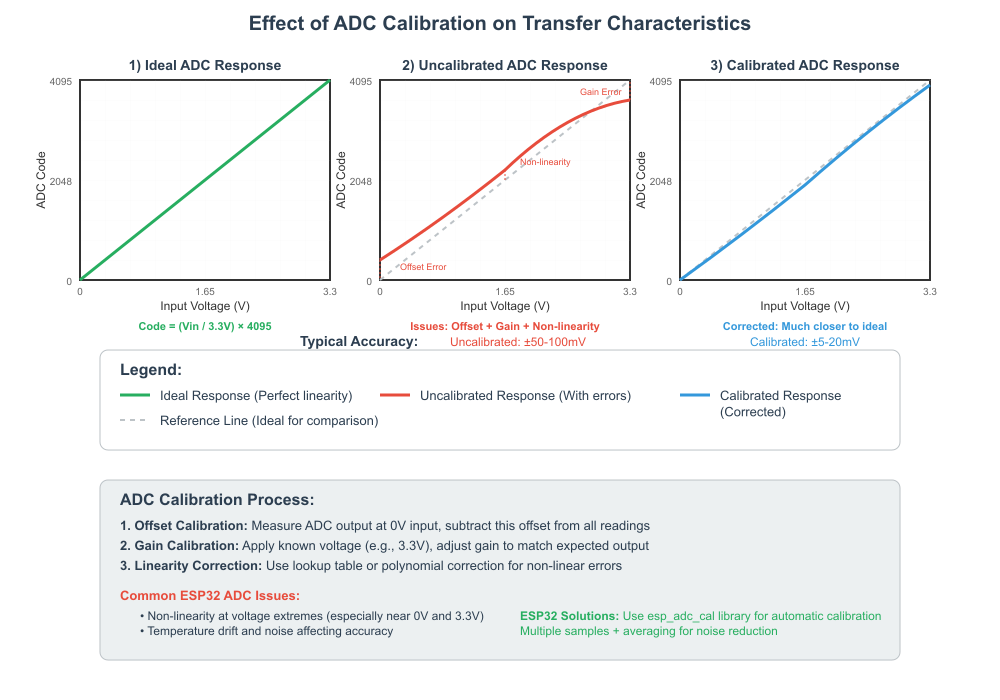 component can use it as a more accurate reference voltage than the nominal default (typically around 1100mV). - This is a single-point calibration, primarily correcting for Vref deviations. It assumes a linear ADC response.