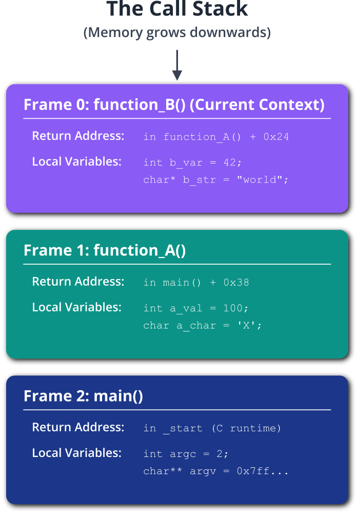 When a program is paused at a breakpoint, your first task is to understand the context. Where is the program, and how did it get here? The primary tool for this is the backtrace. The call stack (or simply “stack”) is a region of memory that keeps track of the active functions in a program. When main()