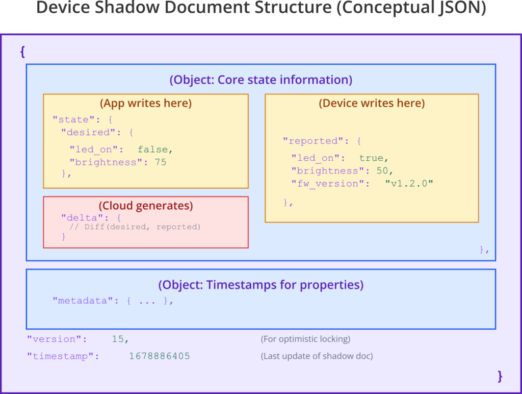 state changes on specific topics. - On connection, devices should synchronize with the latest shadow state. After applying desired changes, they must report their new actual state.