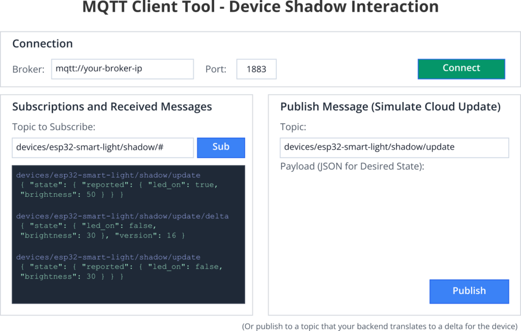 section, and they generate the delta. For this generic example, publishing directly to a delta-like topic that the device subscribes to simplifies simulation). - Observe ESP32 logs: It should receive the delta, apply changes (log messages, LED state change), and then publish its new reported state.