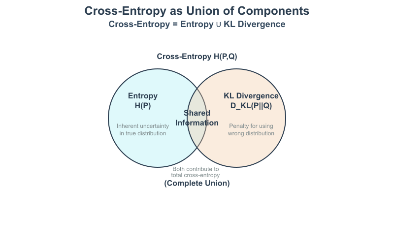 In machine learning, since the entropy of the true data distribution \(H(P)\) is a fixed constant, minimizing the cross-entropy \(H(P, Q)\) is equivalent to minimizing the KL divergence \(D_{KL}(P || Q)\). This is why cross-entropy is so widely used as a loss function: it effectively pushes the model’s predicted distribution \(Q\) to match the true data distribution \(P\).