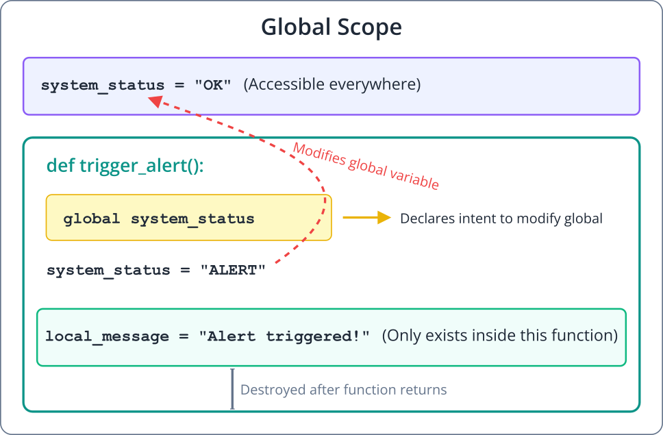 Conversely, variables defined outside of any function, at the top level of a script, have global scope. They can be accessed from anywhere in the file, including from within functions. While global variables can be useful for storing configuration constants or state that must be shared across the entire application, their overuse is a common source of bugs. Modifying a global variable from within a function can lead to confusing behavior that is difficult to trace, as the state of the program is no longer self-contained within its functions. To modify a global variable from within a function, you must explicitly declare your intent with the global