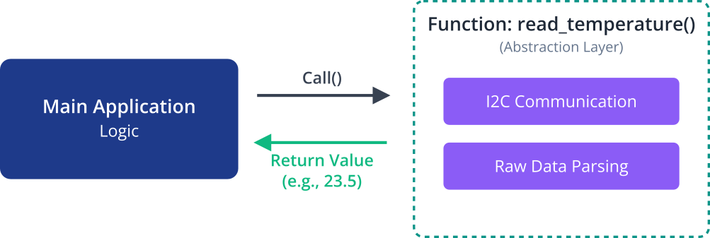 could handle the low-level communication with a temperature sensor over an I2C bus and simply return a floating-point number representing the temperature in Celsius. This abstracts away the complexity of the I2C protocol, allowing the main part of your application to simply call current_temp = read_temperature()