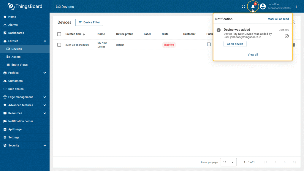 | Customer | A sub-entity of a tenant, representing an end-user or a group within the tenant’s organization. | Can view and manage devices and assets assigned to them by the tenant. Can have their own users and dashboards. |